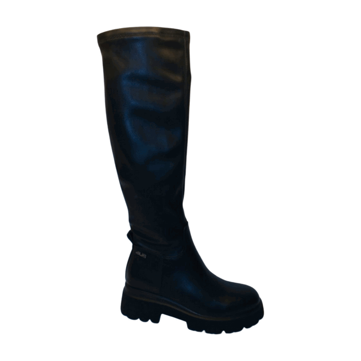 Stivale cuissard donna 4US by Cesare Paciotti in ecopelle total black con gambale elastico al ginocchio. Mini logo metallico laterale, sottopiede morbido in pelle. Fondo gomma, battistrada dentellato con tacco separato altezza 6 cm.