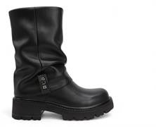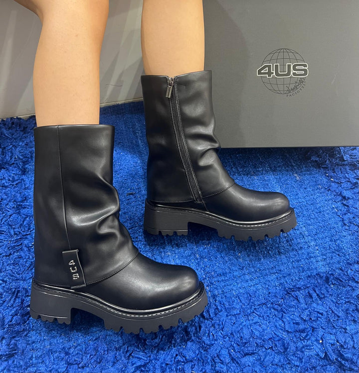 Stivale al polpaccio donna 4Us by Cesare Paciotti in ecopelle total black con risvolto logato. Chiusura con zip sul laterale interno, sottopiede morbido in pelle. Fondo gomma, battistrada dentellato con tacco separato altezza 4.5 cm