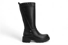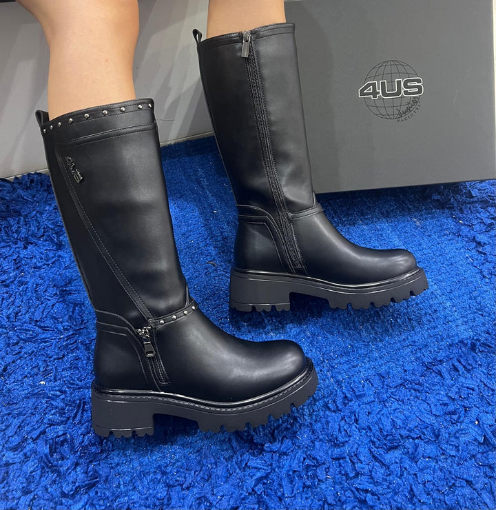 Stivale donna 4US by Cesare Paciotti in ecopelle total black con borchie e finta zip. Chiusura con zip sul laterale interno, sottopiede morbido in pelle. Fondo gomma, battistrada dentellato con tacco separato altezza 4.5 cm