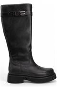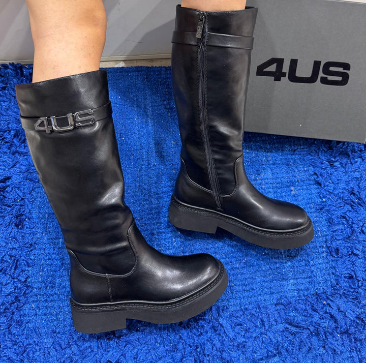 Stivale donna 4US by Cesare Paciotti in ecopelle total black con fibbia logo metallic. Chiusura con zip sul laterale interno, sottopiede morbido in pelle. Fondo gomma con tacco separato altezza 4 cm.