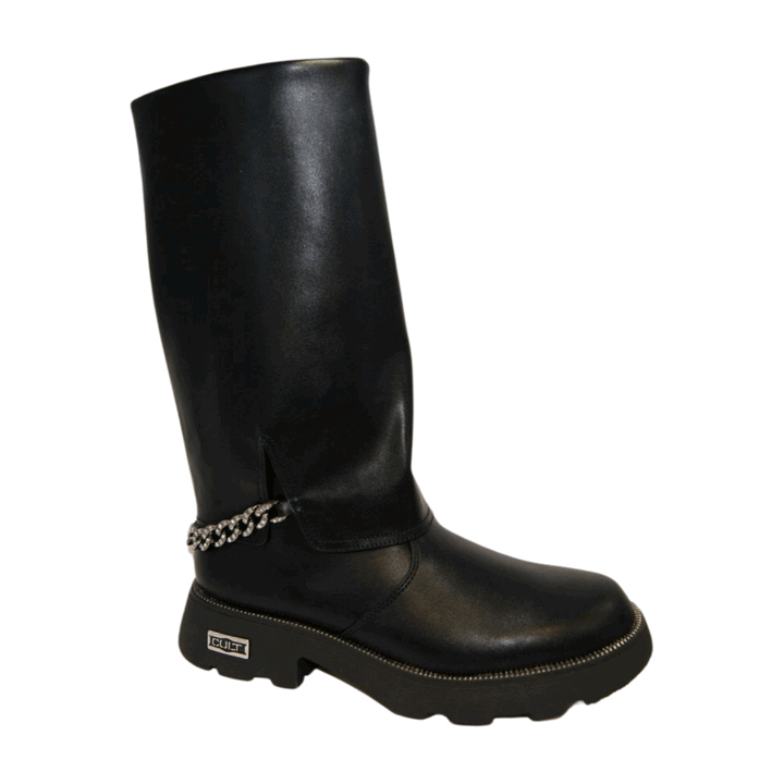 Stivale donna Cult Young in ecopelle total black con risvolto e dettaglio catena silver posteriore. Chiusura con zip sul laterale interno, sottopiede morbido in pelle. Fondo gomma logato, battistrada dentellato con tacco separato altezza 4.5 cm