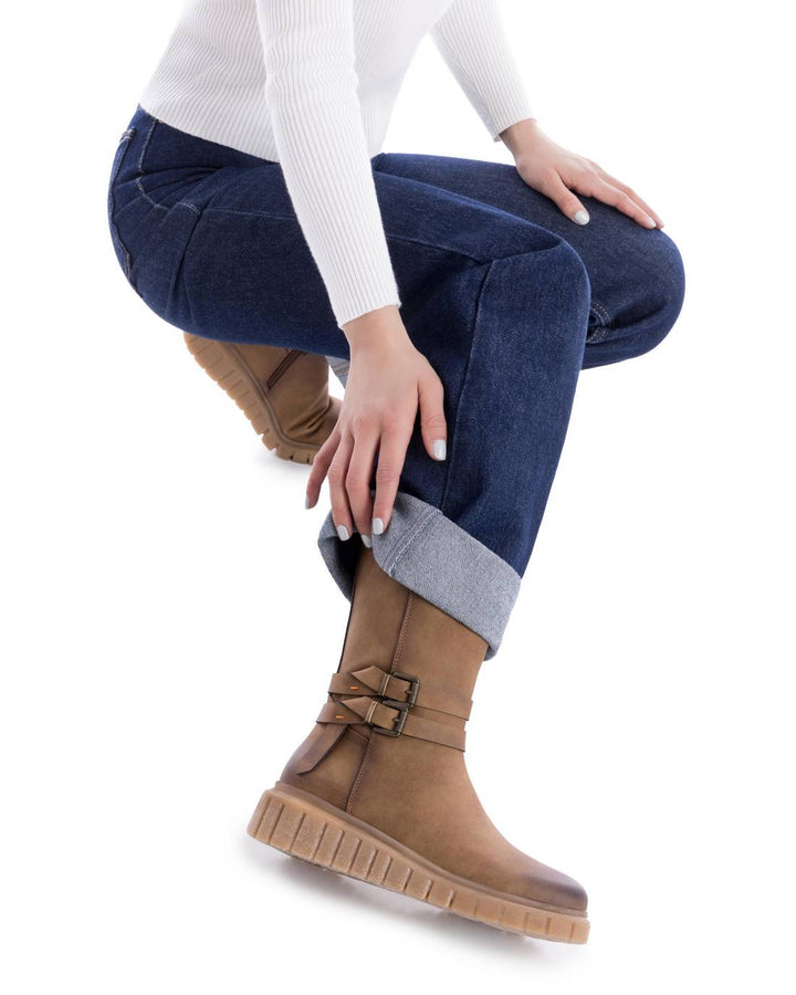 Stivale donna Refresh in ecopelle camel effetto grassato con fibbie alla caviglia. Chiusura con zip sul laterale interno, sottopiede morbido comfort foam. Fondo gomma platform dentellato altezza 3.5 cm