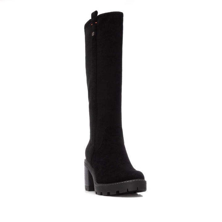 Stivale al ginocchio Refresh in ecocamoscio nero. Chiusura con zip sul laterale interno e piccolo spacchetto elastico. Calza facile laterale, sottopiede morbido comfort foam. Fondo gomma con battistrada dentellato e tacco separato altezza 8 cm.