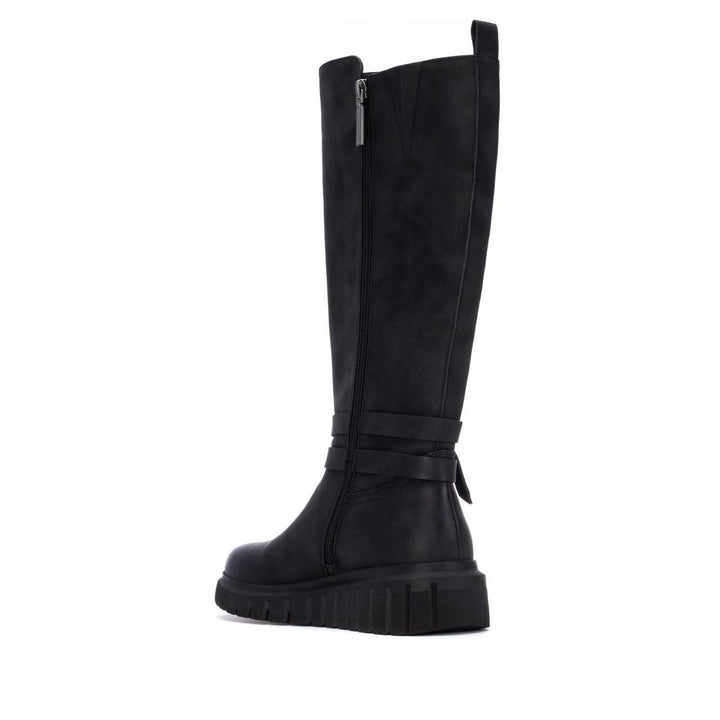Stivale donna Refresh in ecopelle nero effetto grassato con fibbie alla caviglia. Chiusura con zip sul laterale interno, sottopiede morbido comfort foam. Fondo gomma platform dentellato altezza 3.5 cm