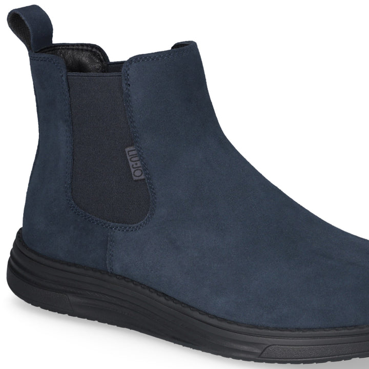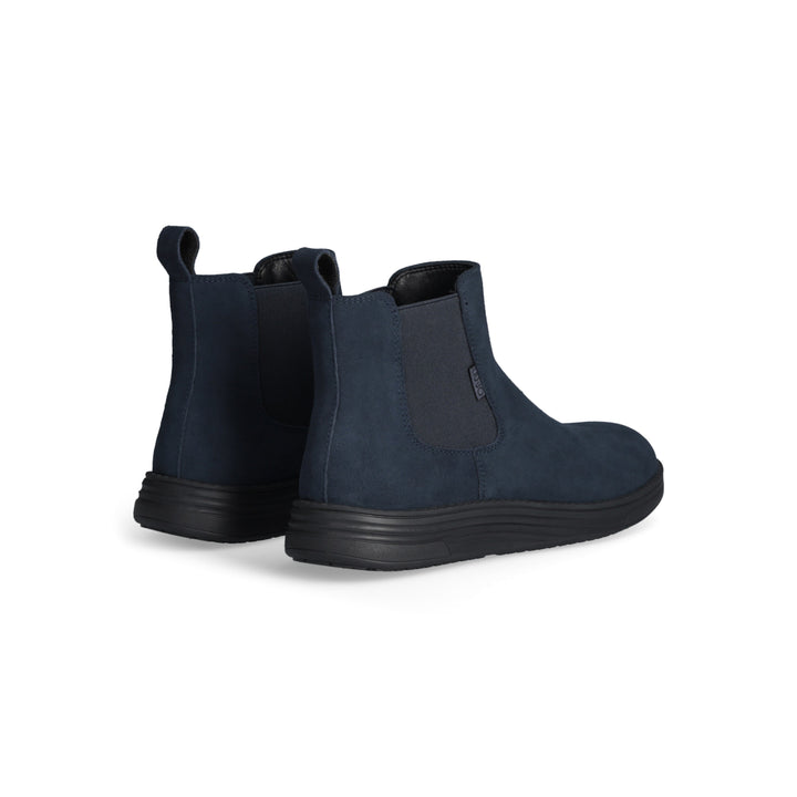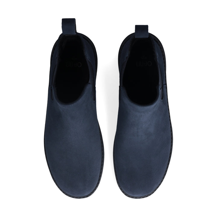 Stivaletto Liu Jo modello beatles da uomo in camoscio blu navy, con inserti elastici laterali e calzafacile posteriore. Sottopiede morbido removibile. Suola leggera antiscivolo in Eva ultra light, altezza 3.5 cm