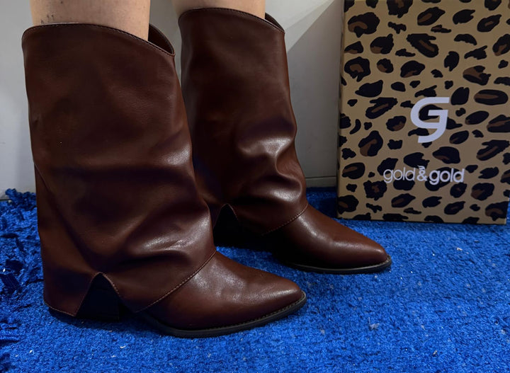 Stivale texano al polpaccio in pelle marrone con risvolto, da infilare a calza. Fondo gomma con tacco separato altezza 5.5 cm