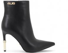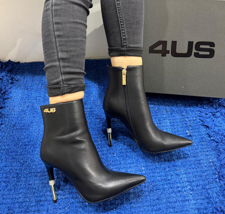 Tronchetto donna 4US by Cesare Paciotti in ecopelle total black con mini logo metallico oro. Chiusura con zip sul laterale interno, sottopiede morbido. Tacco a stiletto cromato oro con dettaglio gioiello altezza 10 cm.