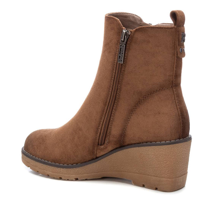 Tronchetto donna Refresh in ecocamoscio camel con inserto finta zip laterale. Chiusura con zip sul laterale interno, sottopiede morbido comfort foam. Calza facile posteriore con logo metallic. Fondo gomma zeppa con battistrada dentellato altezza 7 cm.