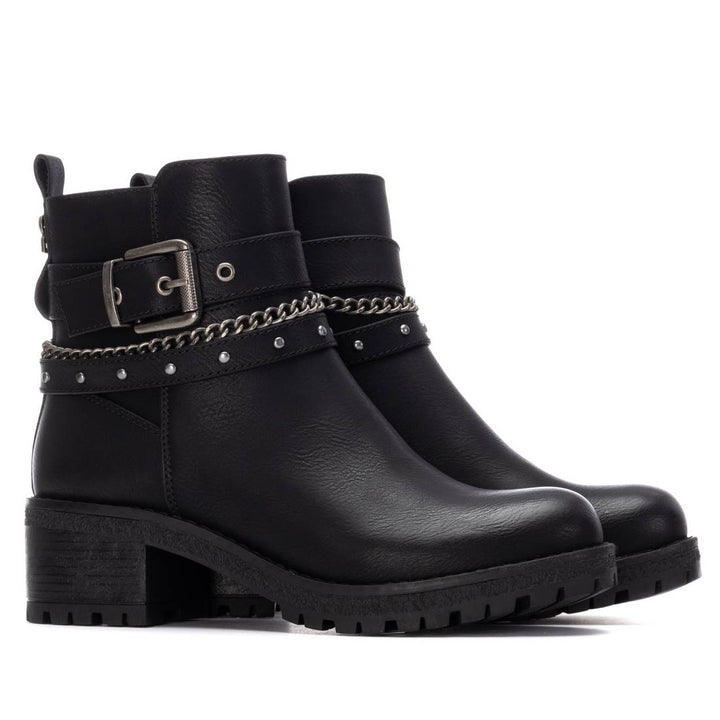 Tronchetto donna Refresh modello biker in ecopelle nero con inserto fibbia, catena e borcheitte tonde. Chiusura con zip sul laterale interno, sottopiede morbido comfort foam. Calza facile posteriore con logo metallic, fondo gomma con battistrada dentellato e tacco separato altezza 5 cm.