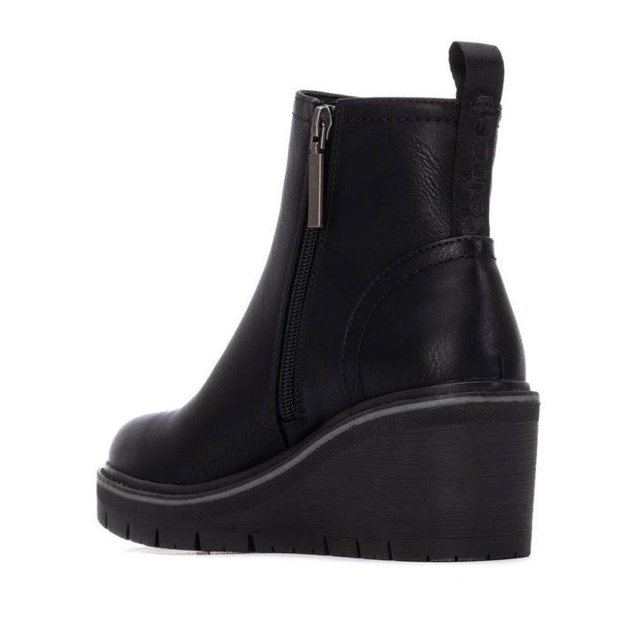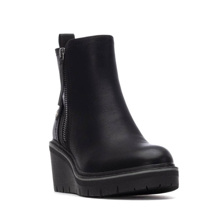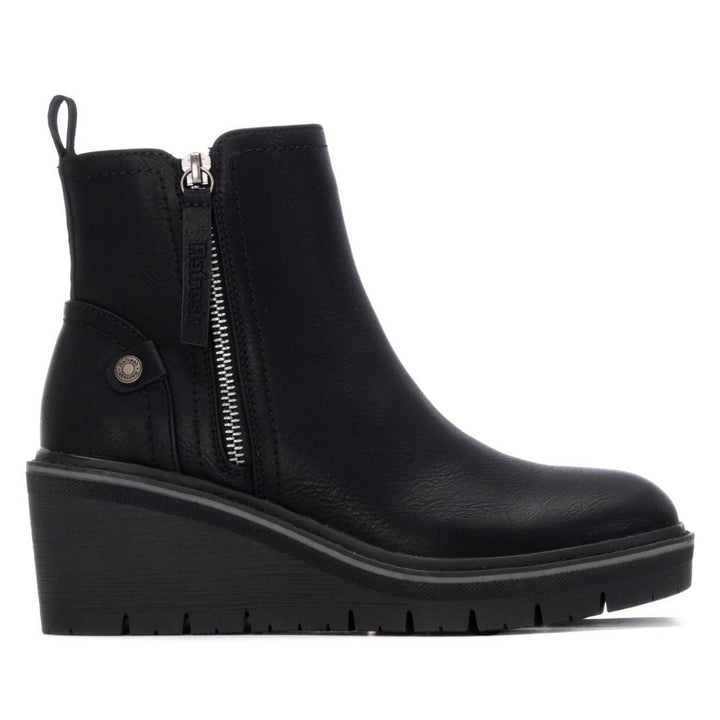 Tronchetto donna Refresh in ecopelle nera effetto grassato con inserto finta zip laterale. Chiusura con zip sul laterale interno, sottopiede morbido comfort foam. Calza facile posteriore logato. Fondo gomma zeppa con battistrada dentellato altezza 6 cm.