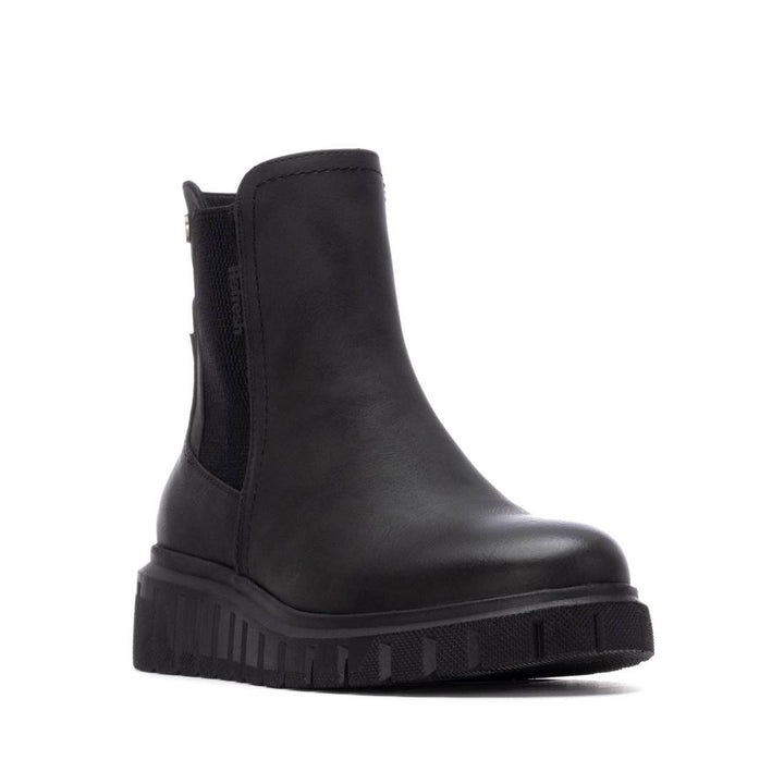 Tronchetto donna Refresh in ecopelle nera effetto grassato con inserto elastico laterale. Chiusura con zip sul laterale interno, sottopiede morbido comfort foam. Fondo gomma platform dentellato altezza 4.5 cm