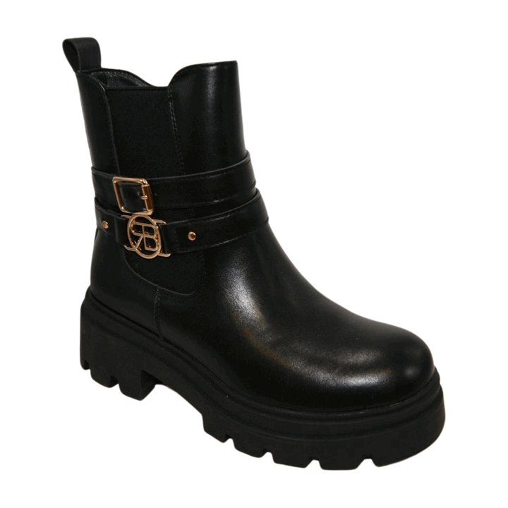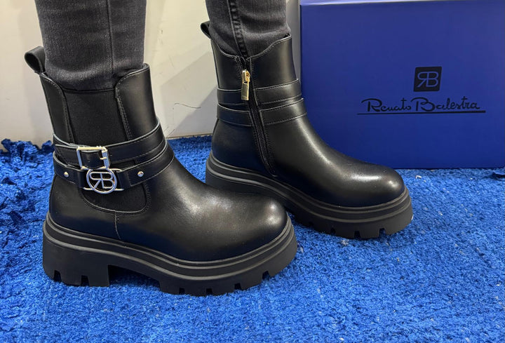 Tronchetto donna Renato Balestra in ecopelle nera. Chiusura zip sul laterale interno e inserto elastico sul laterale esterno. Inserto cinturino e fibbia logo, Plantare comfort foam. Fondo in gomma antiscivolo con battistrada dentellato e tacco separato altezza 4.5 cm