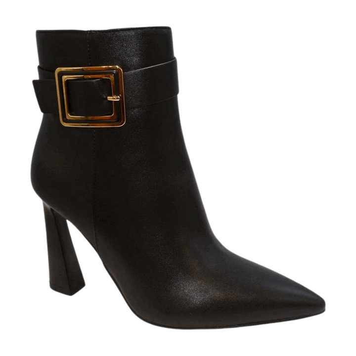 Tronchetto donna Renato Balestra in ecopelle nera con punta sfilata e fibbia. Chiusura zip sul laterale interno, plantare comfort foam. Fondo in gomma antiscivolo con tacco separato altezza 9 cm.