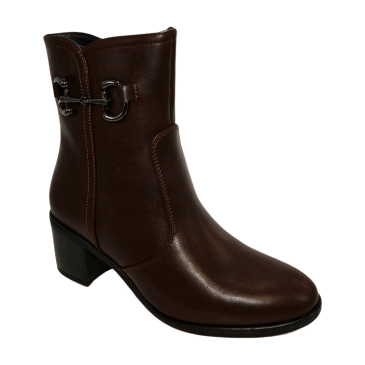 Tronchetto donna Renato Balestra in ecopelle marrone con staffa cromata laterale. Chiusura zip sul laterale interno, plantare comfort foam. Fondo in gomma antiscivolo con tacco separato altezza 5.5 cm