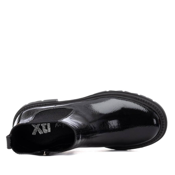 Tronchetto donna Xti in vernice nero con inserto elastico sul laterale esterno e zip sul laterale interno. Sottopiede morbido comfort foam. Calza facile posteriore, fondo gomma con battistrada dentellato e tacco separato altezza 5 cm.