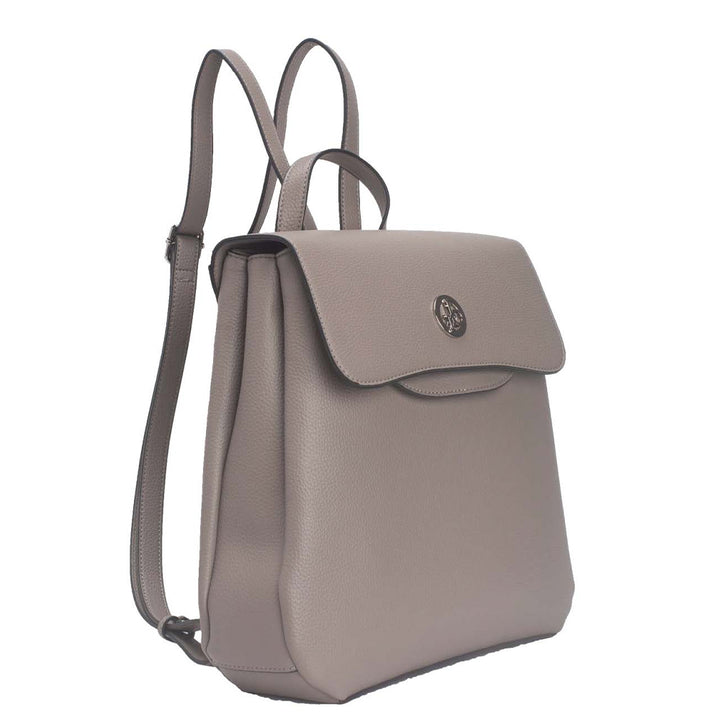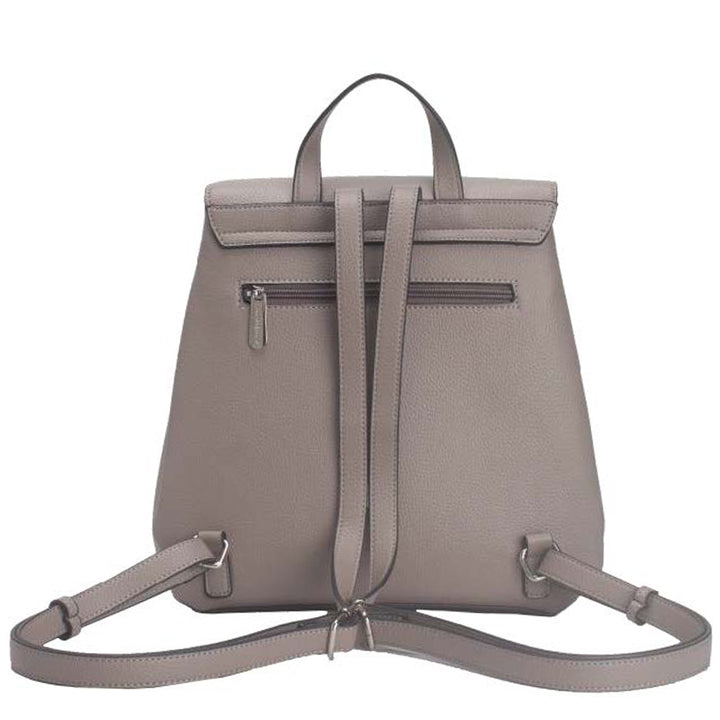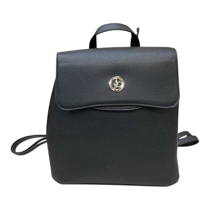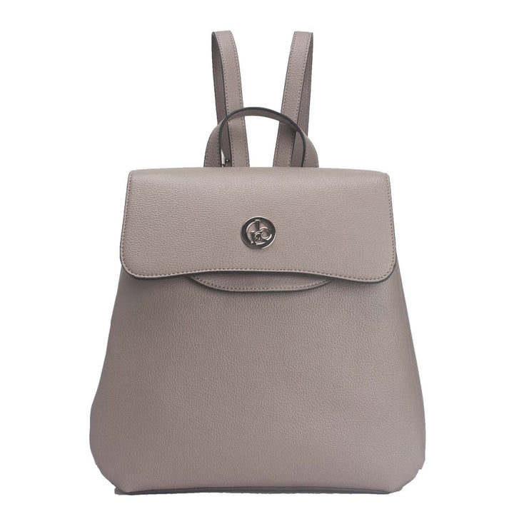 Zaino da donna RoccoBarocco modello in ecopelle bottolata con logo frontale e dettagli in oro. Chiusura patta con clip magnetica, tre tasche interne, due con zip e una con clip. Manico corto rigido, tasca esterna posteriore con cerniera. Spallacci regolabili.