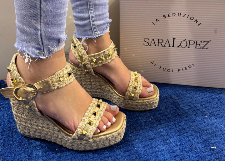 Sandalo Sara Lopez in ecopelle oro e corda a una fascia orizzontale e chiusura cinturino regolabile alla caviglia. Applicazione borchie dorate sulle fasce, sottopiede morbido. Fondo zeppa con inserto corda e lurex oro altezza 10 cm e plateau 3.5 cm